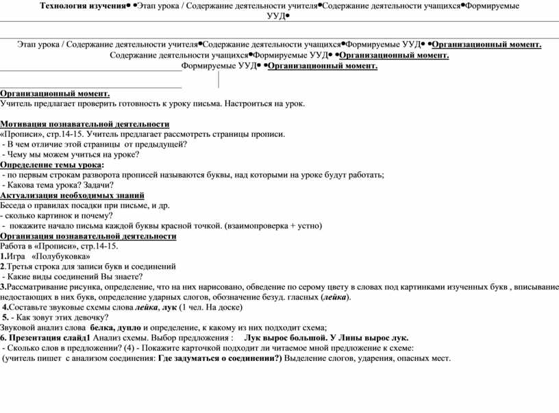 Мотивация познавательной деятельности «Прописи», стр.14-15. Учитель предлагает рассмотреть страницы прописи. - В чем отличие этой страницы от предыдущей? - Чему мы можем учиться на уроке? Определение темы урока: - по первым строкам разворота прописей называются буквы, над которыми на уроке будут работать; - Какова тема урока? Задачи? Актуализация необходимых знаний Беседа о правилах посадки при письме, и др. - сколько картинок и почему? - покажите начало письма каждой буквы красной точкой. (взаимопроверка + устно) Организация познавательной деятельности Работа в «Прописи», стр.14-15. 1.Игра «Полубуковка» 2.Третья строка для записи букв и соединений - Какие виды соединений Вы знаете? 3.Рассматривание рисунка, определение, что на них нарисовано, обведение по серому цвету в словах под картинками изученных букв , вписывание недостающих в них букв, определение ударных слогов, обозначение безуд. гласных (лейка). 4.Составьте звуковые схемы слова лейка, лук (1 чел. На доске) 5. - Как зовут этих девочку? Звуковой анализ слова белка, дупло и определение, к какому из них подходит схема; 6. Презентация слайд1 Анализ схемы. Выбор предложения : Лук вырос большой. У Лины вырос лук. - Сколько слов в предложении? (4) - Покажите карточкой подходит ли читаемое мной предложение к схеме: (учитель пишет с анализом соединения: Где задуматься о соединении?) Выделение слогов, ударения, опасных мест.