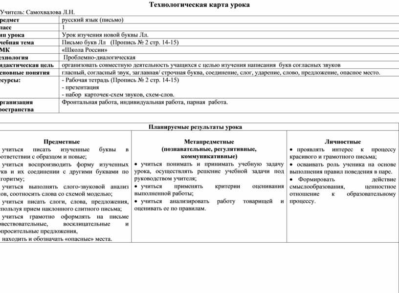 Пишут буквы Л на 1 строчке, контролируют движение руки. дети по половинке буквы узнают её и дописывают. Оценивают выполнение работы по критериям: правильно, аккуратно. Пишут буквы на 2 строчке. Оценивают Пишут слоги и слова на 3 строчке. Оценивают Подчёркивают опасное место Динам/пауза Рассматривание рисунков, определение, что на них нарисовано, обведение по серому цвету в словах под картинками изученных букв и слогов. Пишут слова, делят и выделяют слоги, ставят ударение, выделяют безуд. гласные. Составляют схемы из карточек на парте, сверяют с доской. Оценивают.