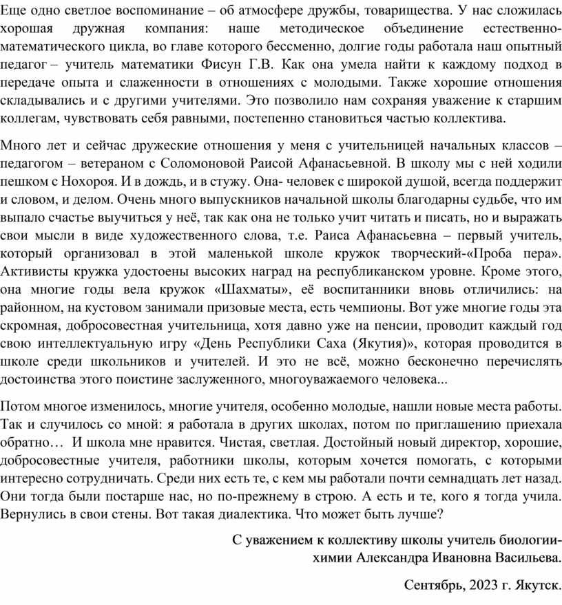 Много лет и сейчас дружеские отношения у меня с учительницей начальных классов –педагогом – ветераном с Соломоновой Раисой Афанасьевной. В школу мы с ней ходили пешком с Нохороя. И в дождь, и в стужу. Она- человек с широкой душой, всегда поддержит и словом, и делом. Очень много выпускников начальной школы благодарны судьбе, что им выпало счастье выучиться у неё, так как она не только учит читать и писать, но и выражать свои мысли в виде художественного слова, т.е. Раиса Афанасьевна – первый учитель, который организовал в этой маленькой школе кружок творческий-«Проба пера». Активисты кружка удостоены высоких наград на республиканском уровне. Кроме этого, она многие годы вела кружок «Шахматы», её воспитанники вновь отличились: на районном, на кустовом занимали призовые места, есть чемпионы. Вот уже многие годы эта скромная, добросовестная учительница, хотя давно уже на пенсии, проводит каждый год свою интеллектуальную игру «День Республики Саха (Якутия)», которая проводится в школе среди школьников и учителей. И это не всё, можно бесконечно перечислять достоинства этого поистине заслуженного, многоуважаемого человека...