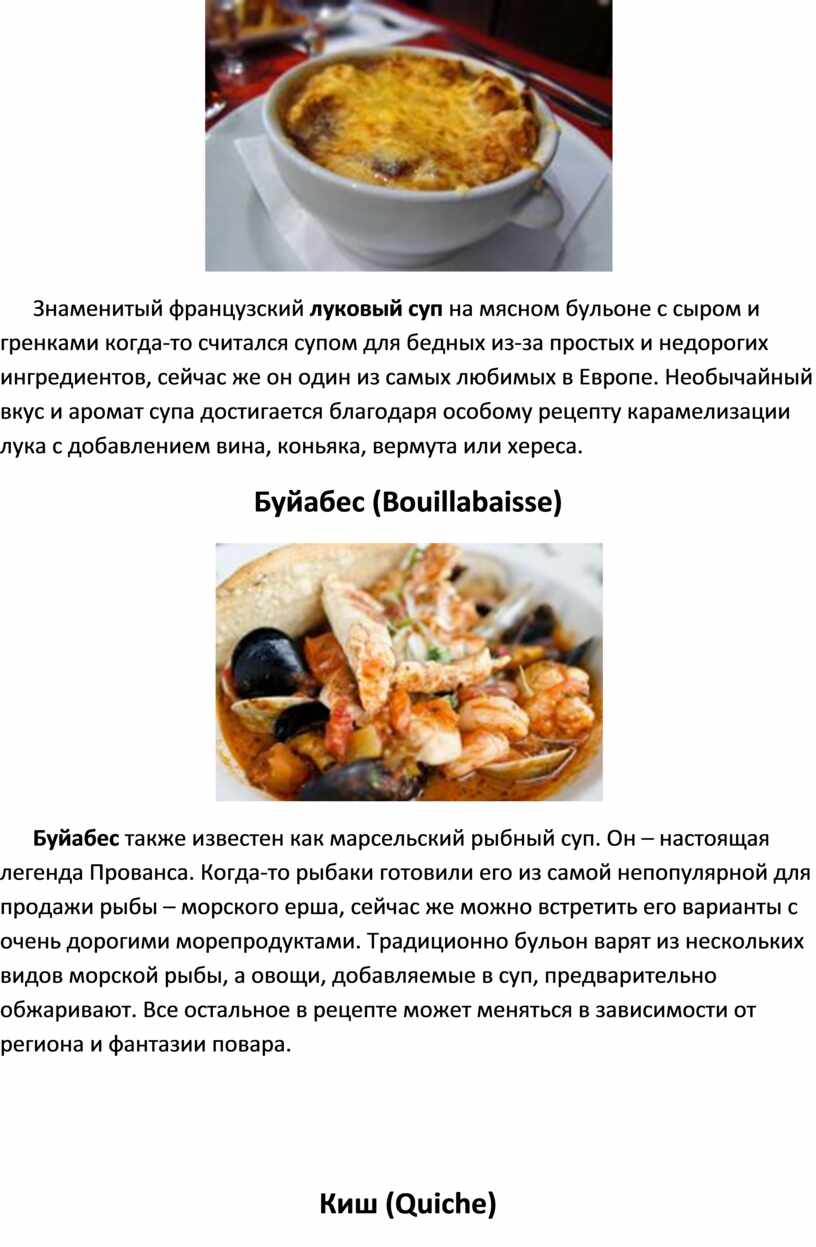 Буйабес также известен как марсельский рыбный суп. Он – настоящая легенда Прованса. Когда-то рыбаки готовили его из самой непопулярной для продажи рыбы – морского ерша, сейчас же можно встретить его варианты с очень дорогими морепродуктами. Традиционно бульон варят из нескольких видов морской рыбы, а овощи, добавляемые в суп, предварительно обжаривают. Все остальное в рецепте может меняться в зависимости от региона и фантазии повара.