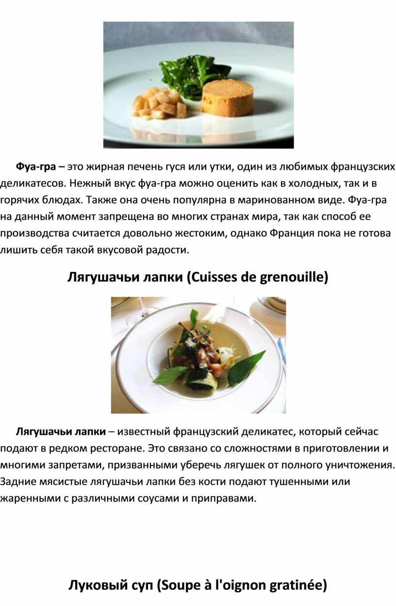 Фуа-гра – это жирная печень гуся или утки, один из любимых французских деликатесов. Нежный вкус фуа-гра можно оценить как в холодных, так и в горячих блюдах. Также она очень популярна в маринованном виде. Фуа-гра на данный момент запрещена во многих странах мира, так как способ ее производства считается довольно жестоким, однако Франция пока не готова лишить себя такой вкусовой радости.