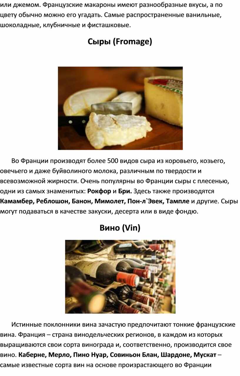 Во Франции производят более 500 видов сыра из коровьего, козьего, овечьего и даже буйволиного молока, различным по твердости и всевозможной жирности. Очень популярны во Франции сыры с плесенью, одни из самых знаменитых: Рокфор и Бри. Здесь также производятся Камамбер, Реблошон, Банон, Мимолет, Пон-л`Эвек, Тампле и другие. Сыры могут подаваться в качестве закуски, десерта или в виде фондю.