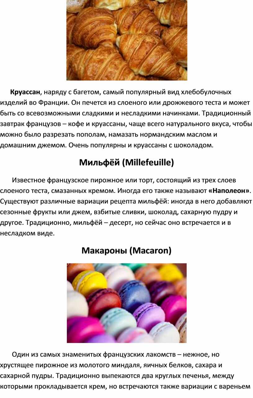 Один из самых знаменитых французских лакомств – нежное, но хрустящее пирожное из молотого миндаля, яичных белков, сахара и сахарной пудры. Традиционно выпекаются два круглых печенья, между которыми прокладывается крем, но встречаются также вариации с вареньем или джемом. Французские макароны имеют разнообразные вкусы, а по цвету обычно можно его угадать. Самые распространенные ванильные, шоколадные, клубничные и фисташковые.
