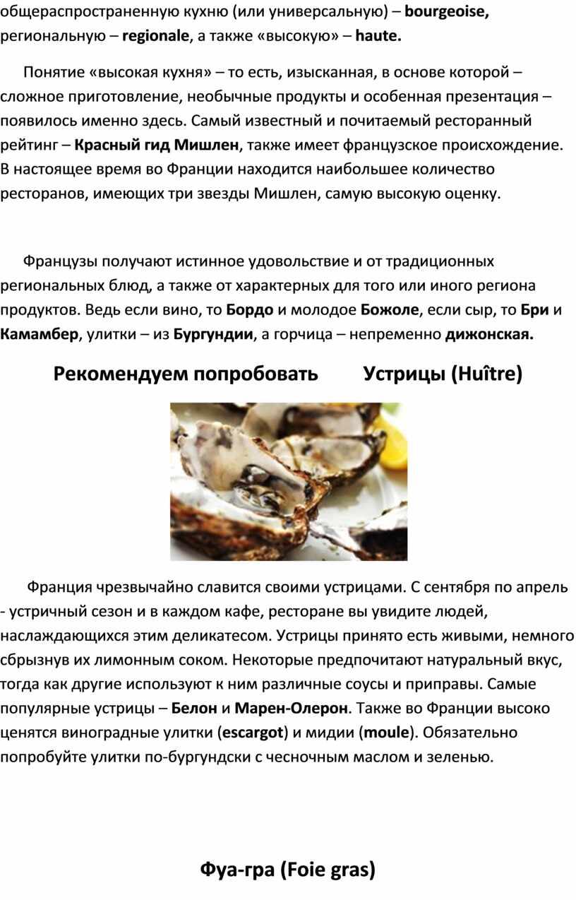 Франция чрезвычайно славится своими устрицами. С сентября по апрель - устричный сезон и в каждом кафе, ресторане вы увидите людей, наслаждающихся этим деликатесом. Устрицы принято есть живыми, немного сбрызнув их лимонным соком. Некоторые предпочитают натуральный вкус, тогда как другие используют к ним различные соусы и приправы. Самые популярные устрицы – Белон и Марен-Олерон. Также во Франции высоко ценятся виноградные улитки (escargot) и мидии (moule). Обязательно попробуйте улитки по-бургундски с чесночным маслом и зеленью.