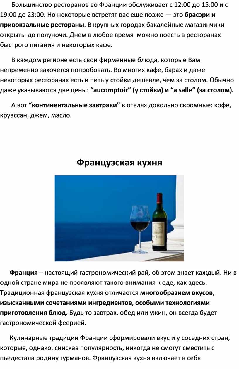 Большинство ресторанов во Франции обслуживает с 12:00 до 15:00 и с 19:00 до 23:00. Но некоторые встретят вас еще позже — это брасэри и привокзальные рестораны. В крупных городах бакалейные магазинчики открыты до полуночи. Днем в любое время можно поесть в ресторанах быстрого питания и некоторых кафе.