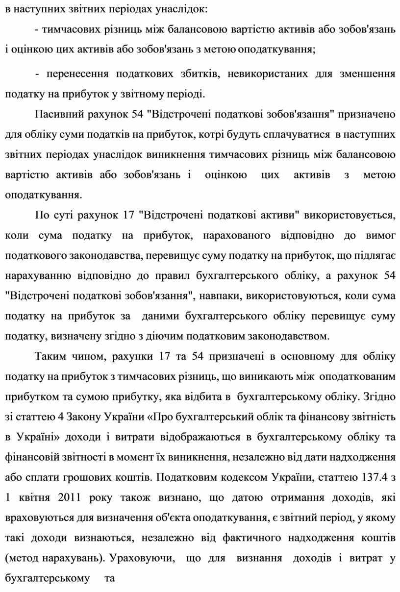 Таким чином, рахунки 17 та 54 призначені в основному для обліку податку на прибуток з тимчасових різниць, що виникають між оподаткованим прибутком та сумою прибутку, яка відбита в бухгалтерському обліку. Згідно зі статтею 4 Закону України «Про бухгалтерський облік та фінансову звітність в Україні» доходи і витрати відображаються в бухгалтерському обліку та фінансовій звітності в момент їх виникнення, незалежно від дати надходження або сплати грошових коштів. Податковим кодексом України, статтею 137.4 з 1 квітня 2011 року також визнано, що датою отримання доходів, які враховуються для визначення об'єкта оподаткування, є звітний період, у якому такі доходи визнаються, незалежно від фактичного надходження коштів (метод нарахувань). Ураховуючи, що для визнання доходів і витрат у бухгалтерському та