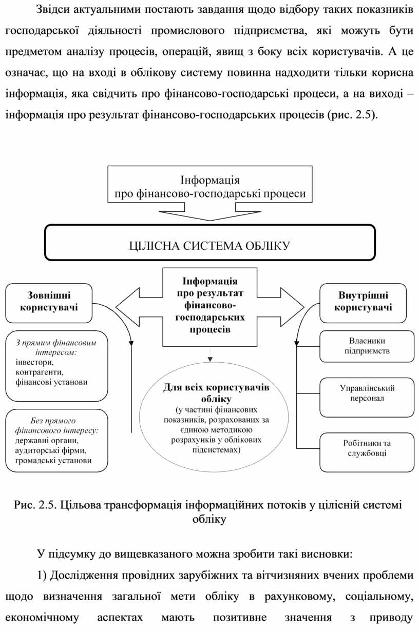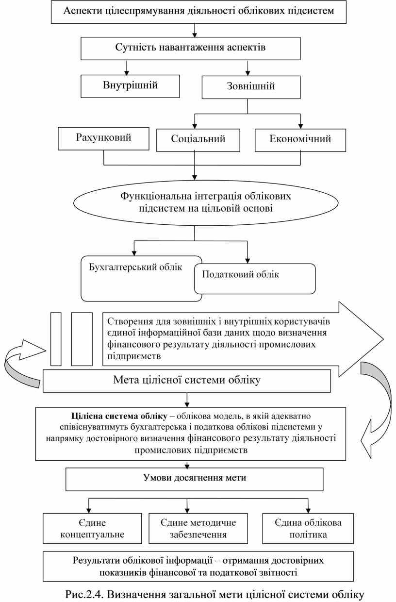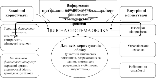 На цьому рисунку через призму дослідження цілеспрямування облікових підсистем у їх функціональній інтеграції схематично представлено процес визначення загальної мети цілісної системи обліку. Отже, нагальну потребу створення цілісної системи обліку можна визначити через її мету, яка полягає в забезпеченні корисною інформацією зовнішніх і внутрішніх користувачів для правильних управлінських рішень.