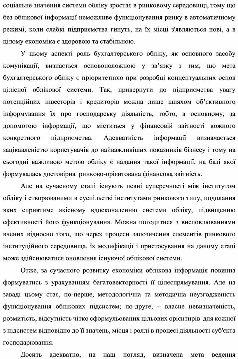 У цьому аспекті роль бухгалтерського обліку, як основного засобу комунікації, визнається основоположною у зв’язку з тим, що мета бухгалтерського обліку є пріоритетною при розробці концептуальних основ цілісної облікової системи. Так, привернути до підприємства увагу потенційних інвесторів і кредиторів можна лише шляхом об’єктивного інформування їх про господарську діяльність, тобто, в основному, за допомогою інформації, що міститься у фінансовій звітності кожного конкретного підприємства. Адекватність інформації визначається зацікавленістю користувачів до найважливіших показників бізнесу і тому на сьогодні важливою метою обліку є надання такої інформації, на базі якої формувалась достовірна ринково-орієнтована фінансова звітність.