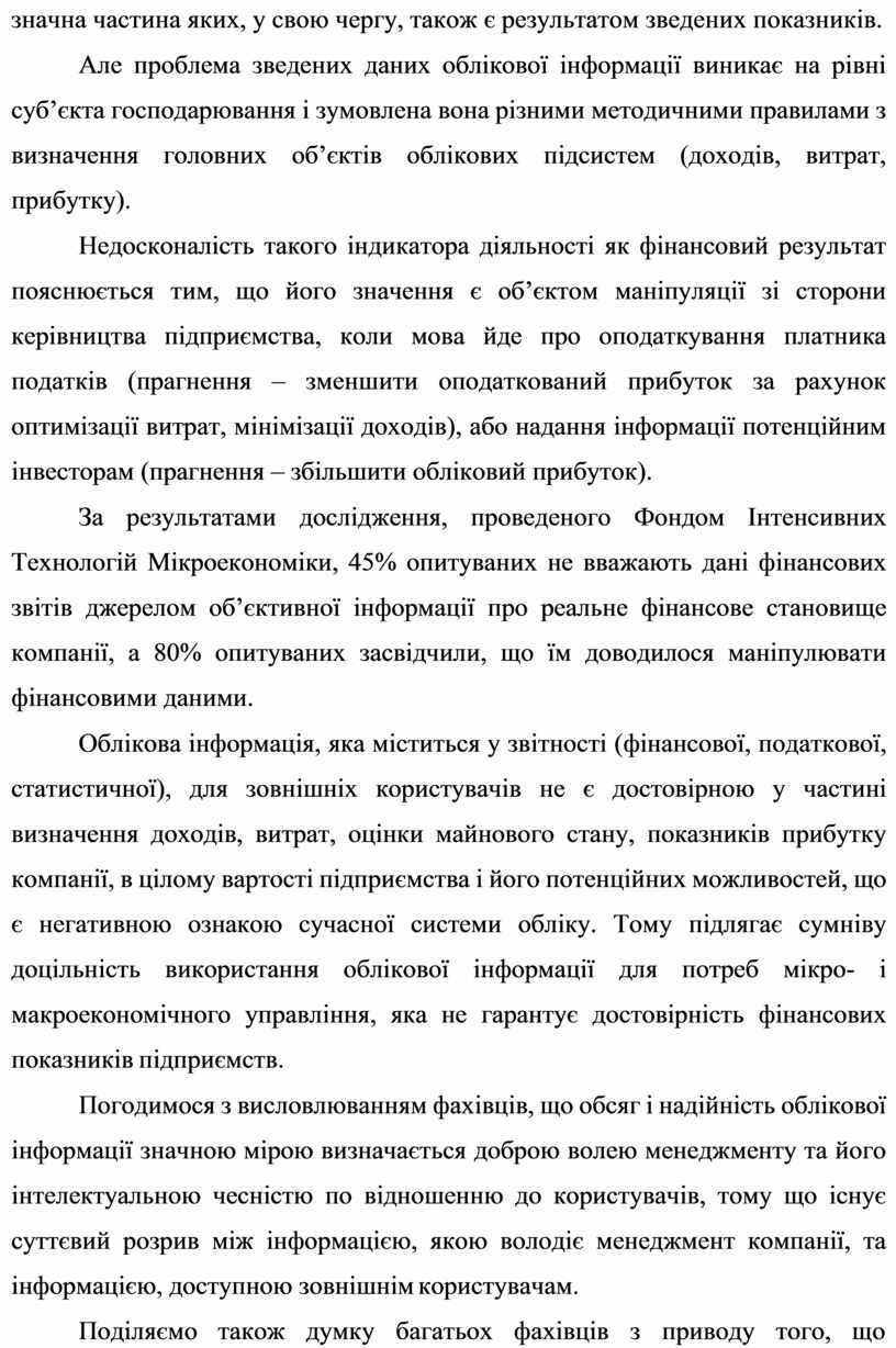 За результатами дослідження, проведеного Фондом Інтенсивних Технологій Мікроекономіки, 45% опитуваних не вважають дані фінансових звітів джерелом об’єктивної інформації про реальне фінансове становище компанії, а 80% опитуваних засвідчили, що їм доводилося маніпулювати фінансовими даними.