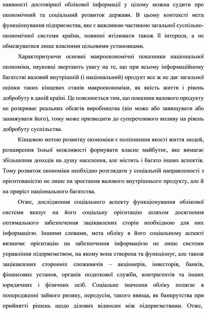 наявності достовірної облікової інформації у цілому можна судити про економічний та соціальний розвиток держави. В цьому контексті мета функціонування підприємства, яке є важливою частиною загальної суспільно-економічної системи країни, повинні втілювати також її інтереси, а не обмежуватися лише власними цільовими установками.