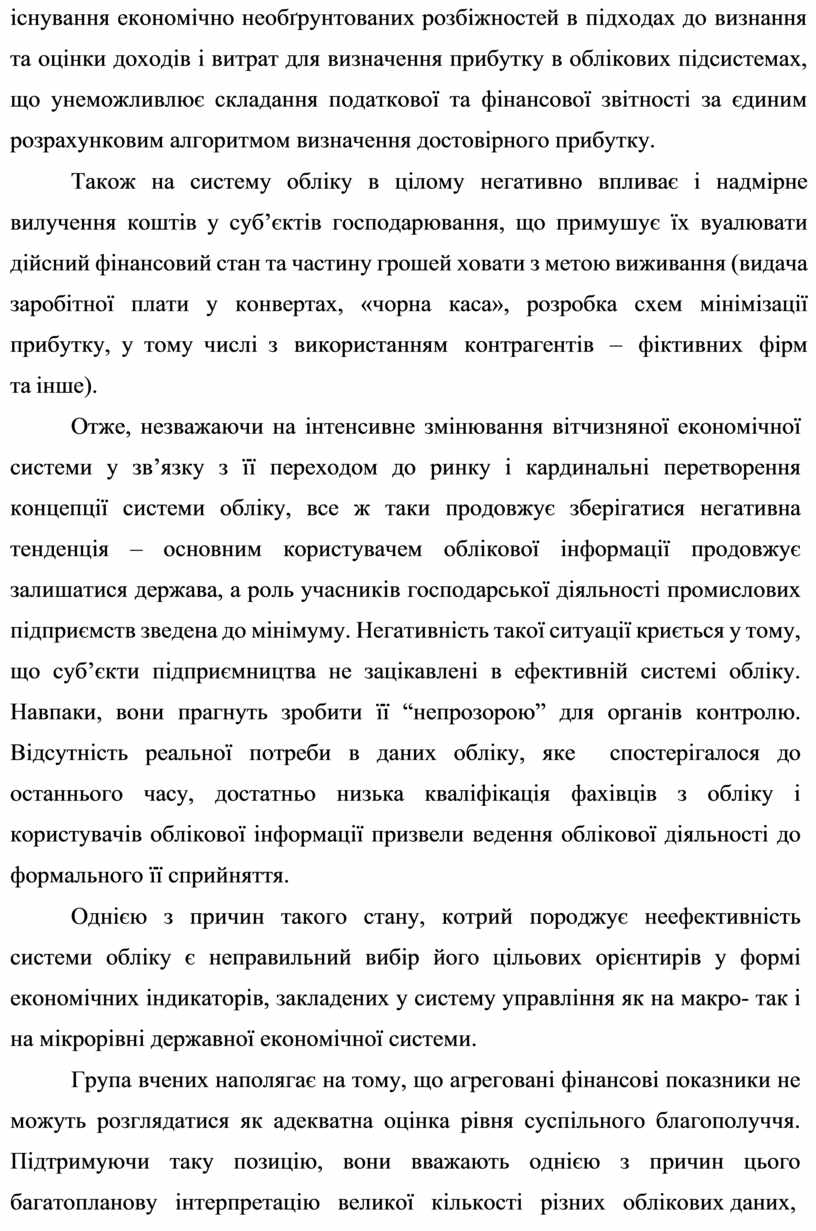 Однією з причин такого стану, котрий породжує неефективність системи обліку є неправильний вибір його цільових орієнтирів у формі економічних індикаторів, закладених у систему управління як на макро- так і на мікрорівні державної економічної системи.