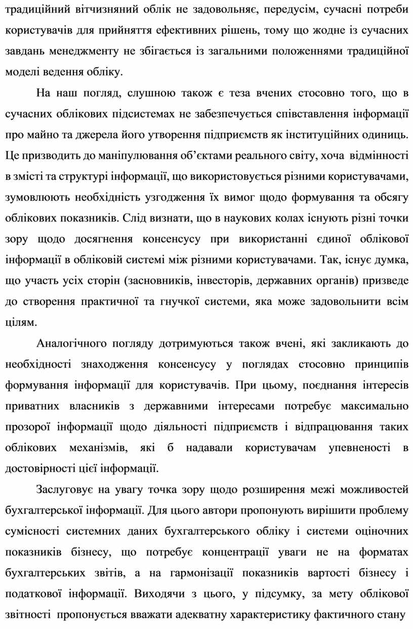 Аналогічного погляду дотримуються також вчені, які закликають до необхідності знаходження консенсусу у поглядах стосовно принципів формування інформації для користувачів. При цьому, поєднання інтересів приватних власників з державними інтересами потребує максимально прозорої інформації щодо діяльності підприємств і відпрацювання таких облікових механізмів, які б надавали користувачам упевненості в достовірності цієї інформації.
