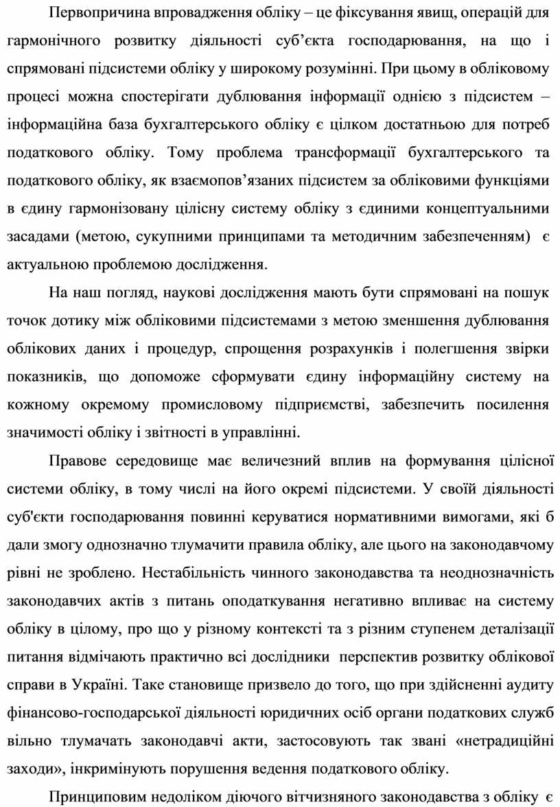 Первопричина впровадження обліку – це фіксування явищ, операцій для гармонічного розвитку діяльності суб’єкта господарювання, на що і спрямовані підсистеми обліку у широкому розумінні. При цьому в обліковому процесі можна спостерігати дублювання інформації однією з підсистем – інформаційна база бухгалтерського обліку є цілком достатньою для потреб податкового обліку. Тому проблема трансформації бухгалтерського та податкового обліку, як взаємопов’язаних підсистем за обліковими функціями в єдину гармонізовану цілісну систему обліку з єдиними концептуальними засадами (метою, сукупними принципами та методичним забезпеченням) є актуальною проблемою дослідження.