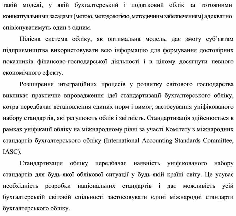 Розширення інтеграційних процесів у розвитку світового господарства викликає практичне впровадження ідеї стандартизації бухгалтерського обліку, котра передбачає встановлення єдиних норм і вимог, застосування уніфікованого набору стандартів, які регулюють облік і звітність. Стандартизація здійснюється в рамках уніфікації обліку на міжнародному рівні за участі Комітету з міжнародних стандартів бухгалтерського обліку (International Accounting Standards Committee, IASC).