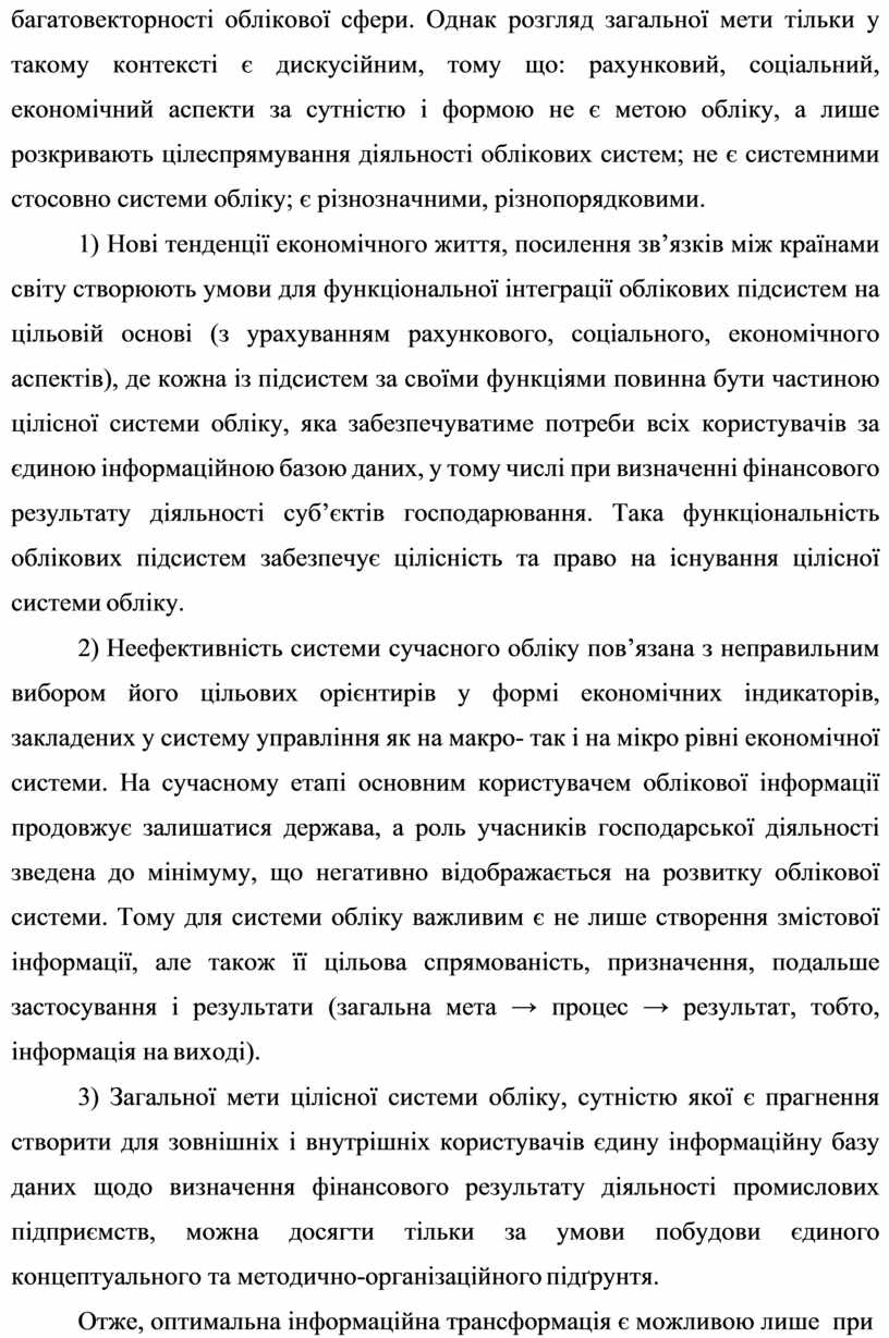 4) Загальної мети цілісної системи обліку, сутністю якої є прагнення створити для зовнішніх і внутрішніх користувачів єдину інформаційну базу даних щодо визначення фінансового результату діяльності промислових підприємств, можна досягти тільки за умови побудови єдиного концептуального та методично-організаційного підґрунтя.