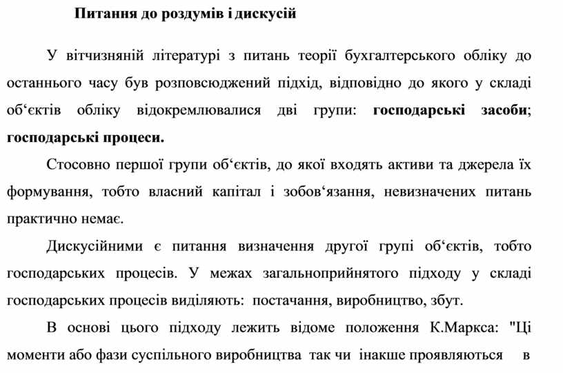 У вітчизняній літературі з питань теорії бухгалтерського обліку до останнього часу був розповсюджений підхід, відповідно до якого у складі об‘єктів обліку відокремлювалися дві групи: господарські засоби; господарські процеси.