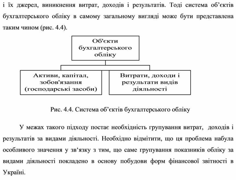 і їх джерел, виникнення витрат, доходів і результатів. Тоді система об’єктів бухгалтерського обліку в самому загальному вигляді може бути представлена таким чином (рис. 4.4).