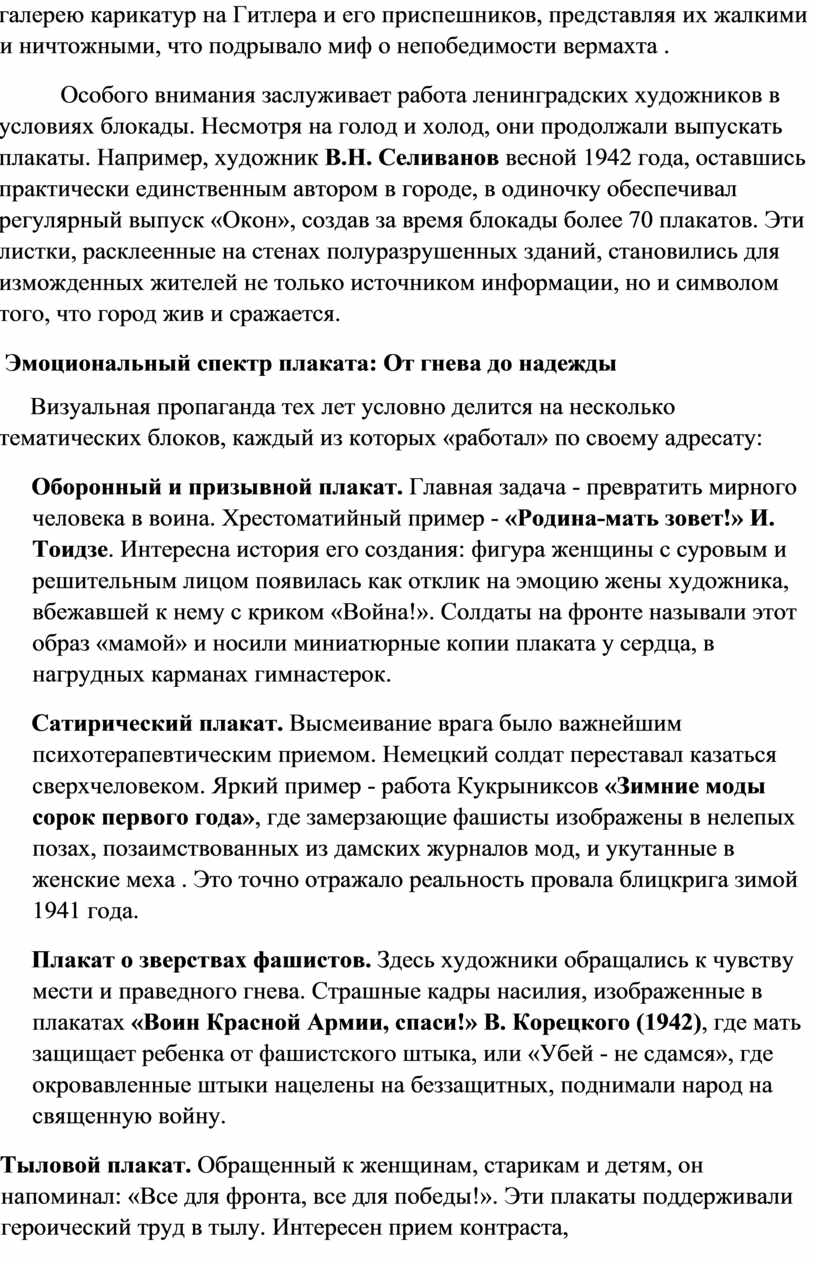 противостояние «третьим фронтом» . В экстремальных условиях 1941–1945 годов искусство перестало быть просто отражением жизни - оно стало ее активным участником, мощнейшим оружием. И главным калибром этого оружия стал плакат. Оперативный, доходчивый, эмоциональный, он доходил до каждого бойца в окопе и каждого рабочего у станка, формируя необходимые для Победы чувства: ненависть к врагу, любовь к Родине, веру в стойкость.