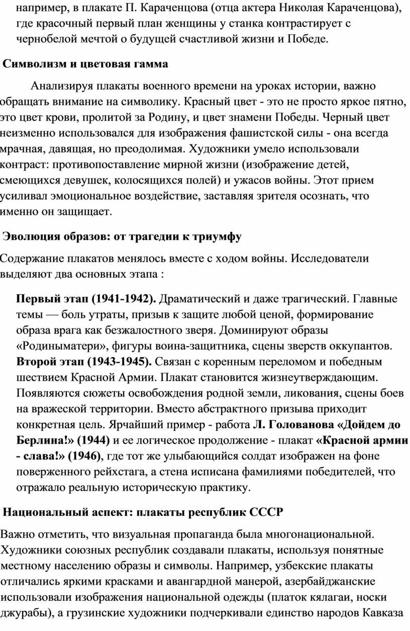 Отечественной войны. Анализируется эволюция художественных образов, их влияние на сознание граждан и значение плаката как исторического источника, отражающего настроения эпохи. В работе также освещаются региональные особенности плакатного искусства и прослеживается трансформация визуального языка от трагедии первых месяцев до триумфа 1945 года. Материал может быть использован на уроках истории, МХК и внеклассных мероприятиях.