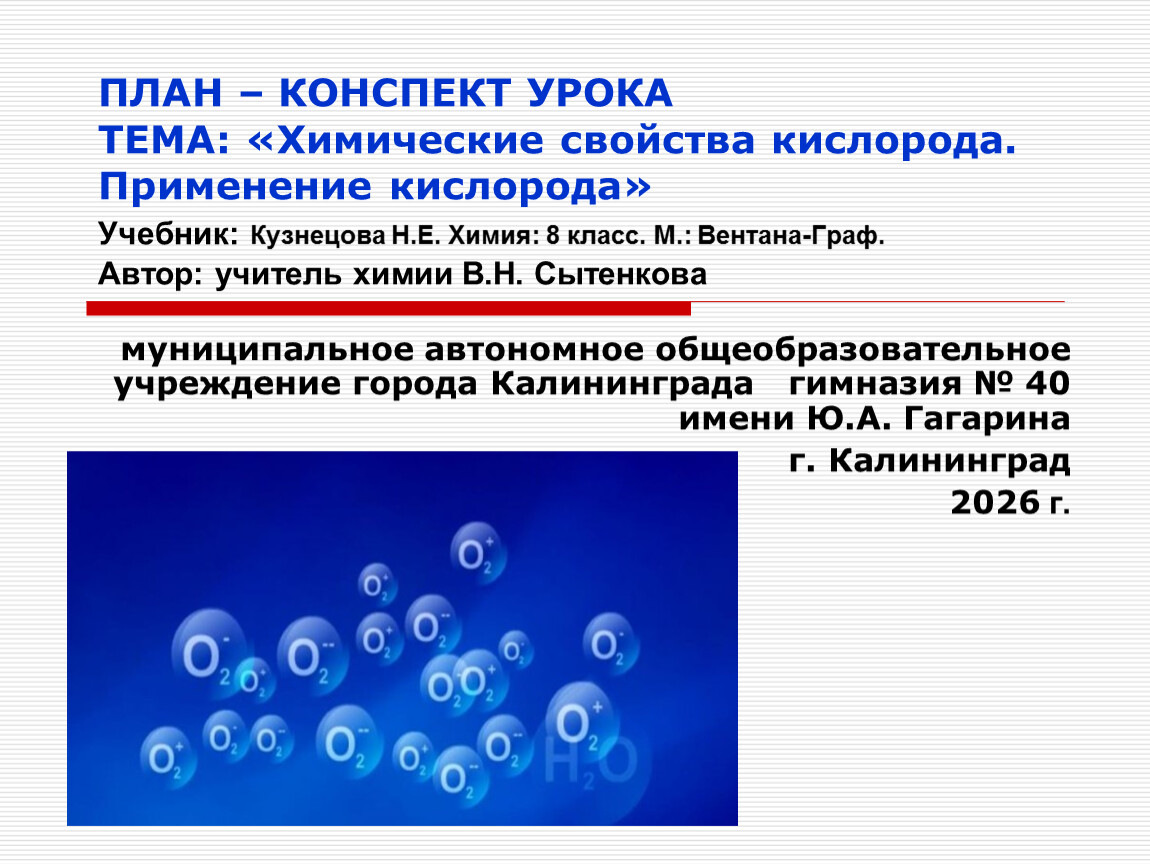 ПЛАН – КОНСПЕКТ УРОКАТЕМА: «Химические свойства кислорода. Применение кислорода»Учебник: Кузнецова Н.Е. Химия: 8 класс. М.: Вентана-Граф.Автор: учитель химии В.Н. Сытенкова