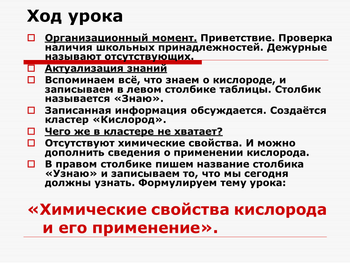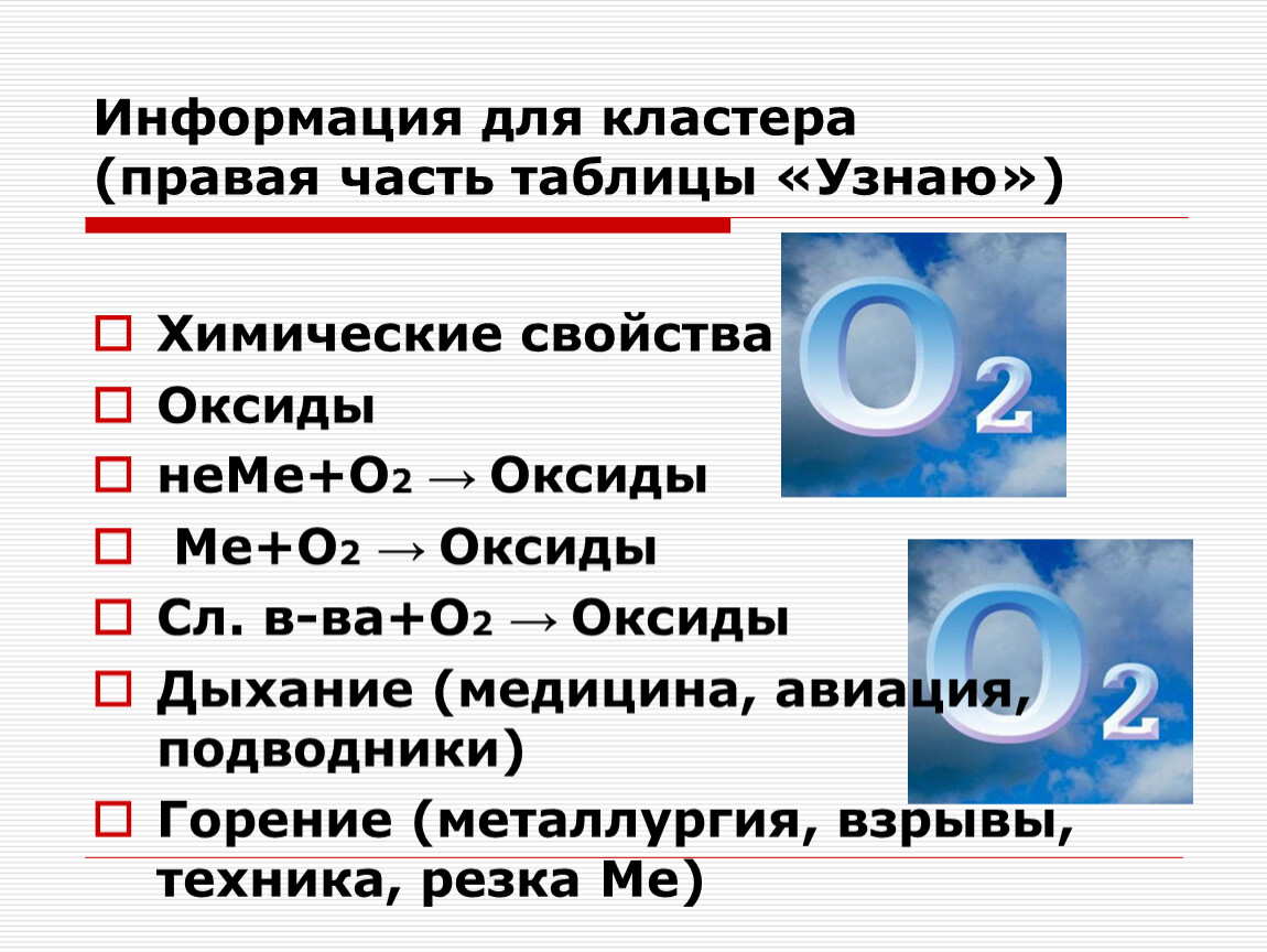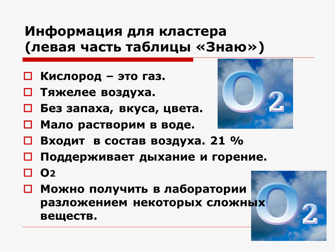 Вспоминаем всё, что знаем о кислороде, и записываем в левом столбике таблицы. Столбик называется «Знаю».