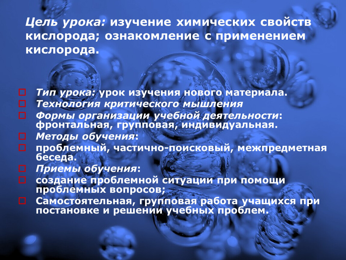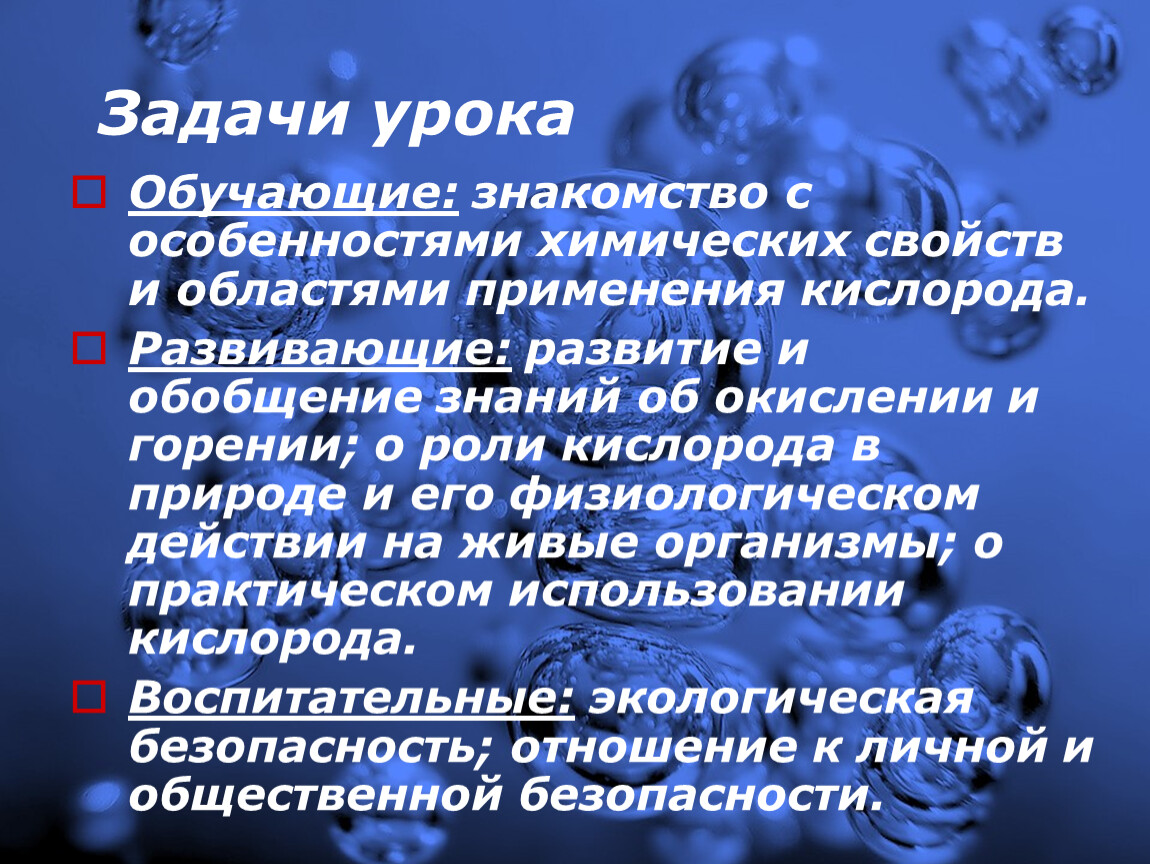 Развивающие: развитие и обобщение знаний об окислении и горении; о роли кислорода в природе и его физиологическом действии на живые организмы; о практическом использовании кислорода.