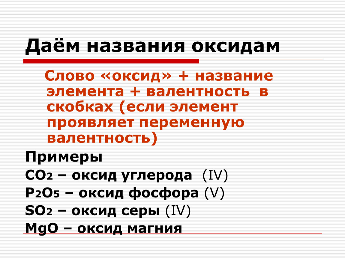 Слово «оксид» + название элемента + валентность в скобках (если элемент проявляет переменную валентность)
