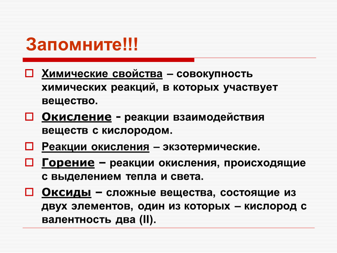 Химические свойства – совокупность химических реакций, в которых участвует вещество.