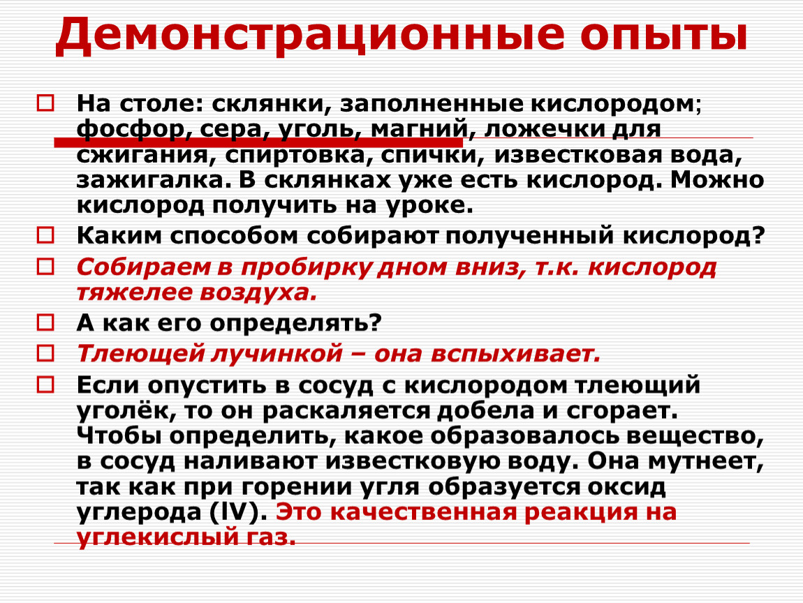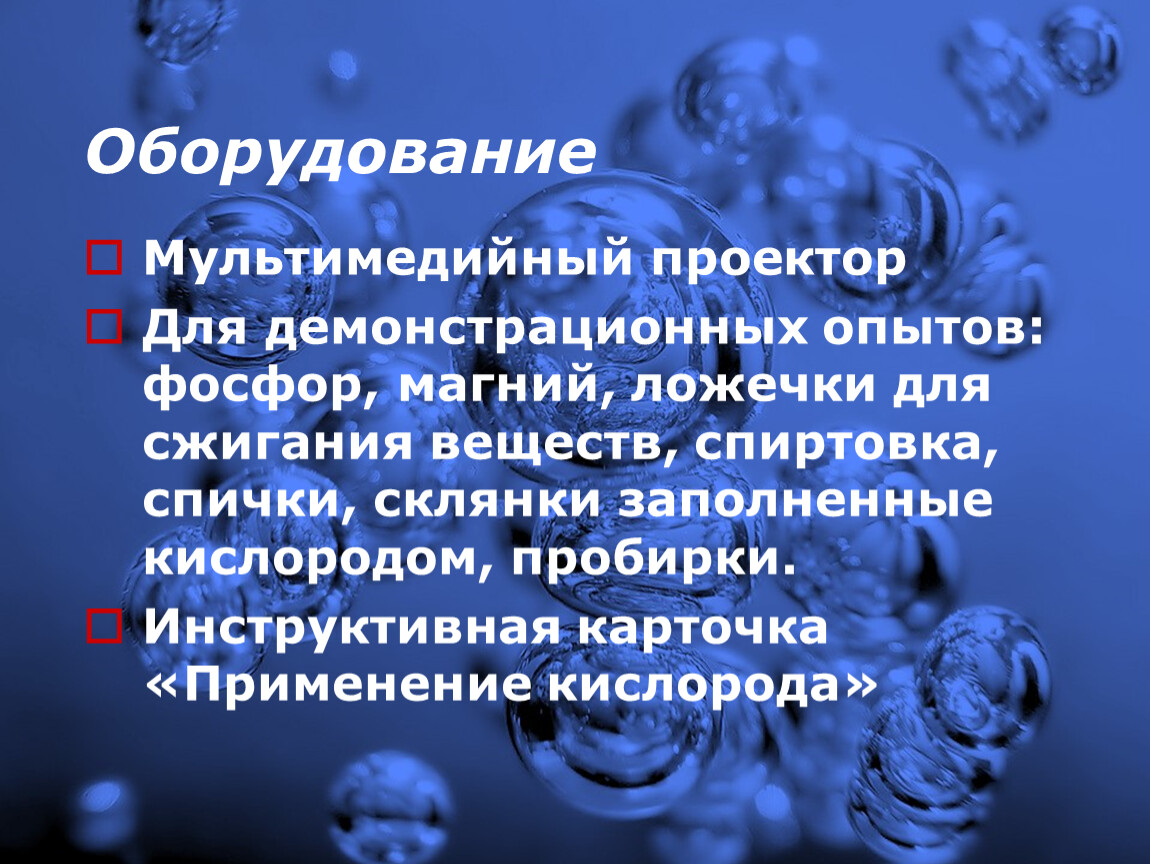 Для демонстрационных опытов: фосфор, магний, ложечки для сжигания веществ, спиртовка, спички, склянки заполненные кислородом, пробирки.