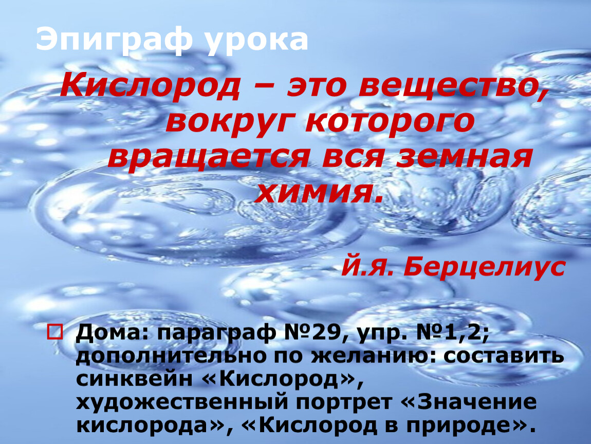 Дома: параграф №29, упр. №1,2; дополнительно по желанию: составить синквейн «Кислород», художественный портрет «Значение кислорода», «Кислород в природе».