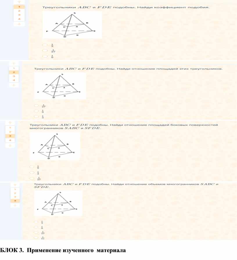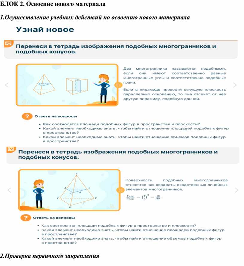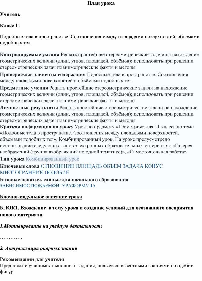 площадями поверхностей, объемами подобных тел». Комбинированный урок. На уроке