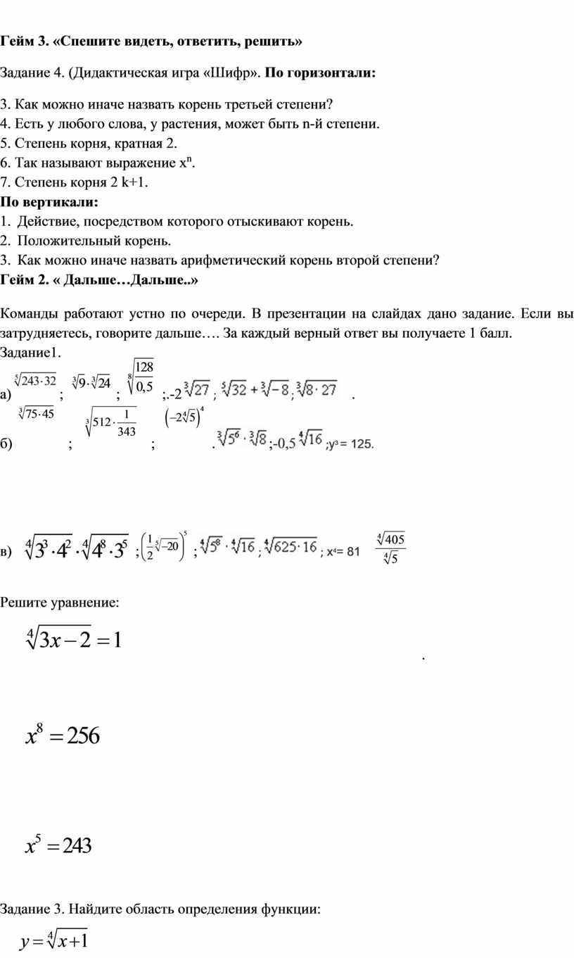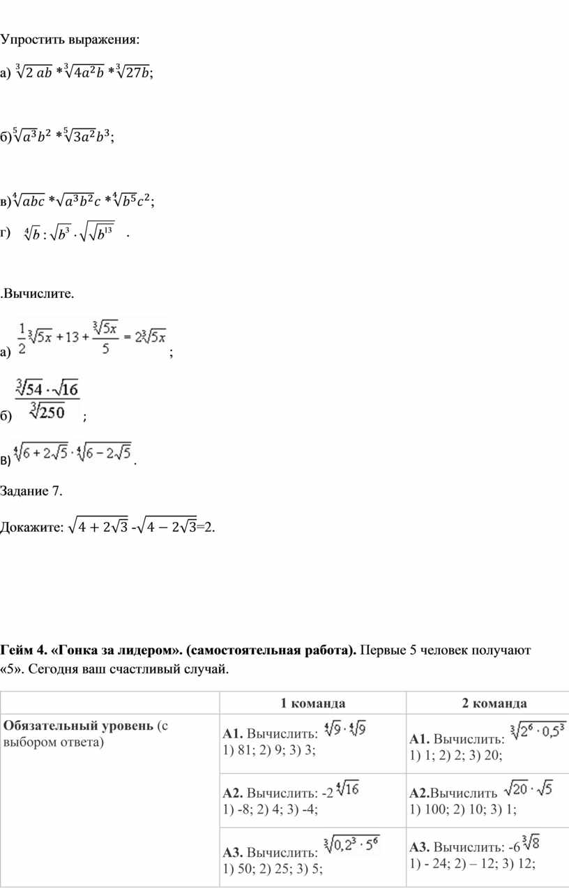 Сегодня урок пройдет в форме игры «Счастливый случай». Мы повторим тему «Арифметический корень натуральной степени», закрепим понятие корня n-й степени и его свойства. В игре примут участие 3 команды: 3 ряда учащихся. В каждом гейме команды будут получать баллы. Победит та команда, которая наберет наибольшее количество баллов.