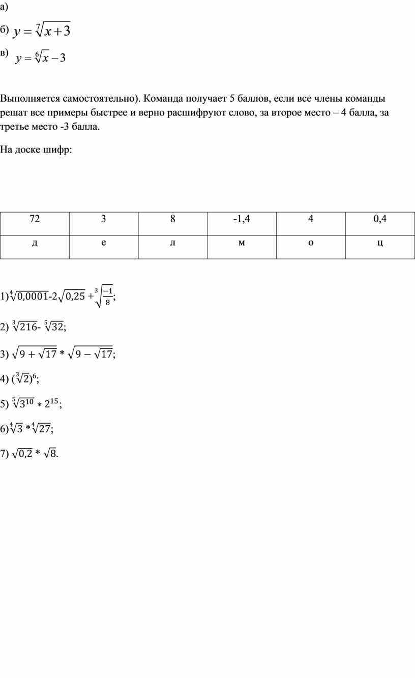 Выполняется самостоятельно). Команда получает 5 баллов, если все члены команды решат все примеры быстрее и верно расшифруют слово, за второе место – 4 балла, за третье место -3 балла.
