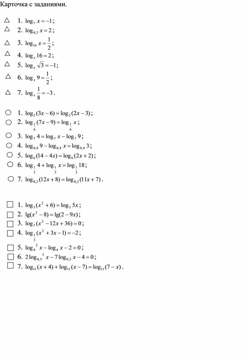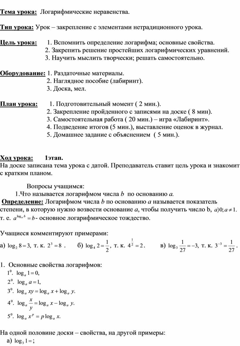 Цель урока: 1. Вспомнить определение логарифма; основные свойства.