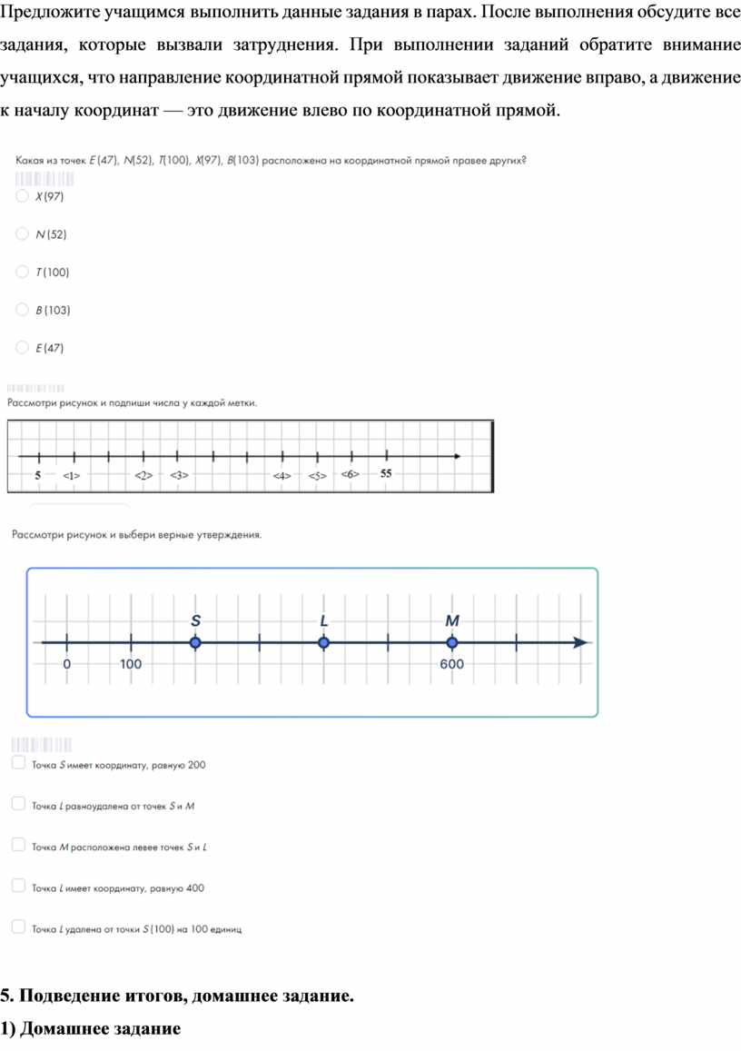 Предложите учащимся выполнить данные задания в парах. После выполнения обсудите все задания, которые вызвали затруднения. При выполнении заданий обратите внимание учащихся, что направление координатной прямой показывает движение вправо, а движение к началу координат — это движение влево по координатной прямой.