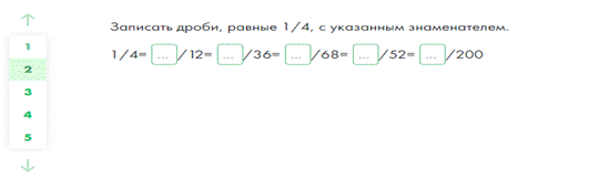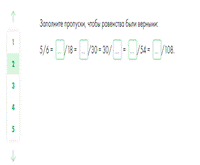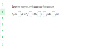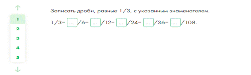 Заполняем пропуски в цепочках равных дробей по алгоритму: найти число, на которое нужно умножить знаменатель данной дроби, чтобы получить новый знаменатель; умножить на это число не только знаменатель дроби, но и её числитель.