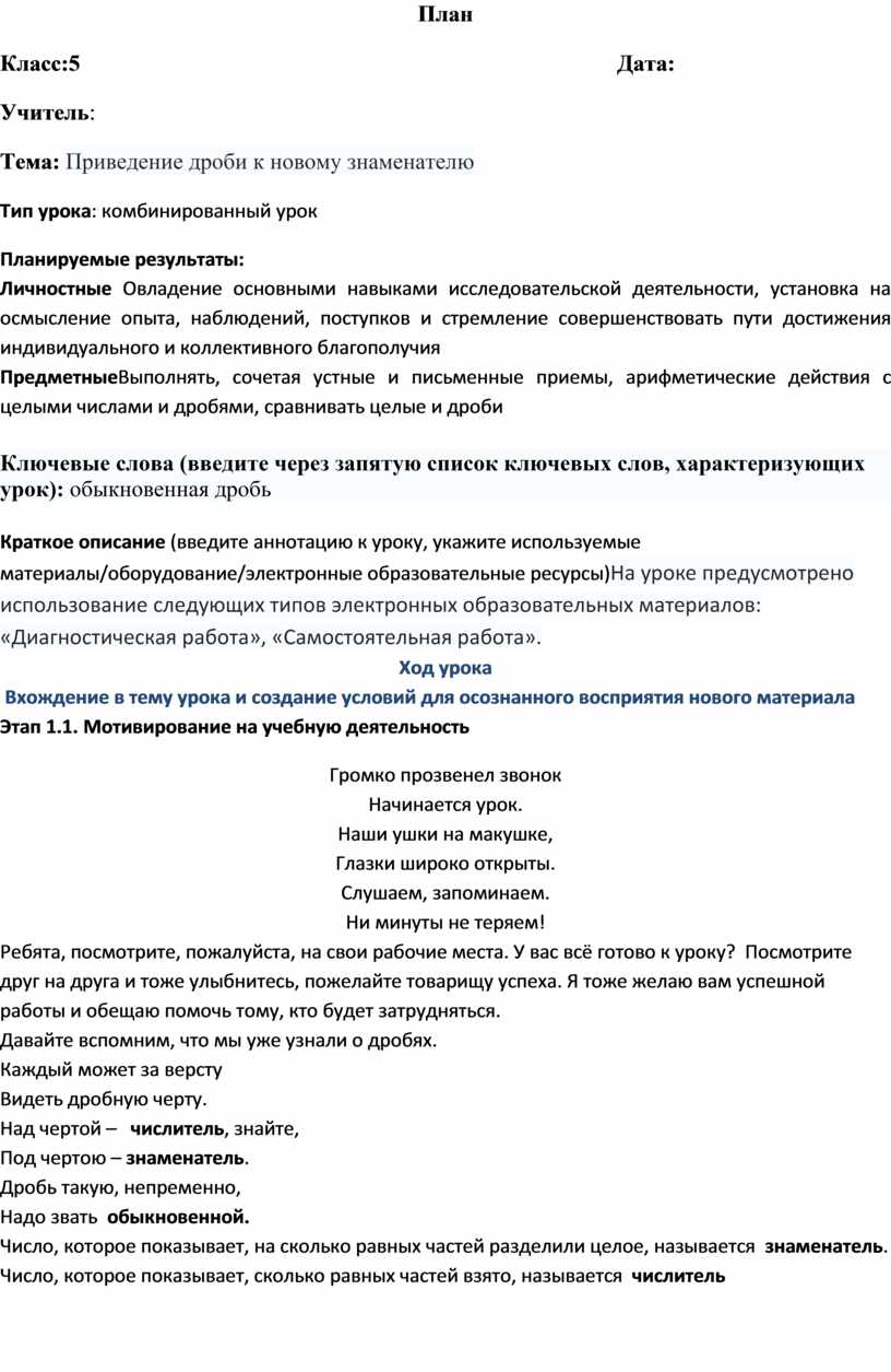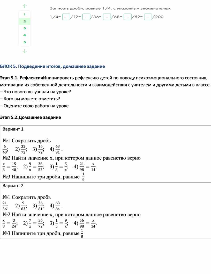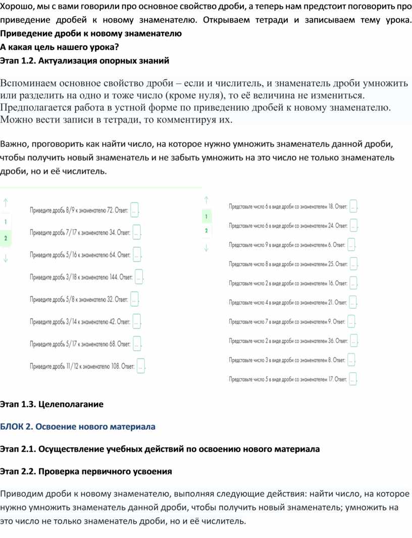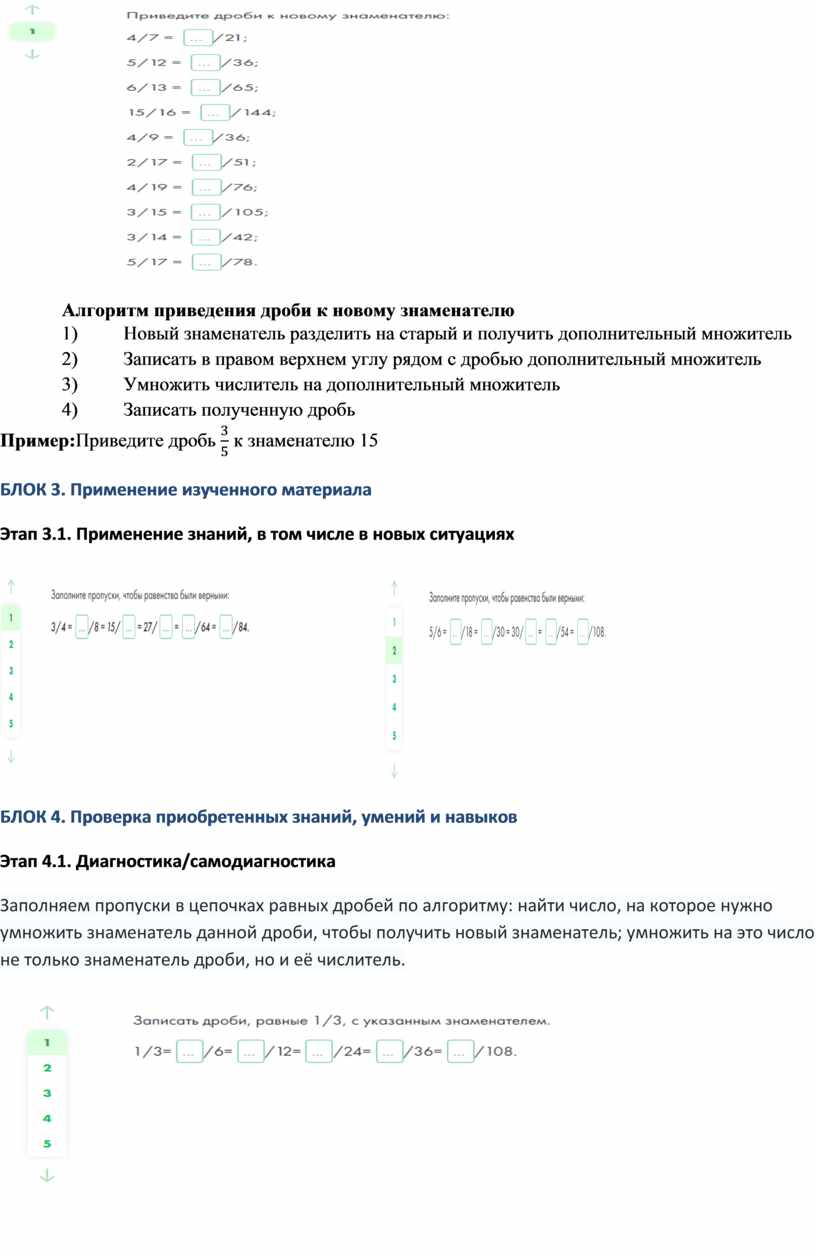 Предполагается работа в устной форме по приведению дробей к новому знаменателю. Можно вести записи в тетради, то комментируя их.