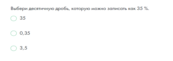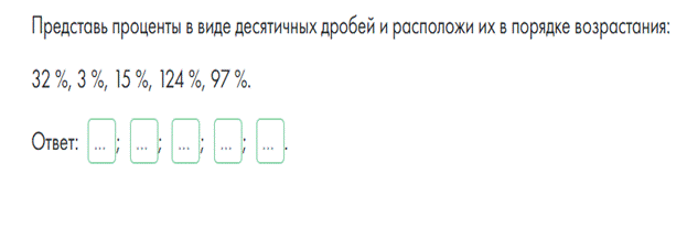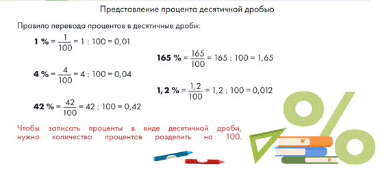 Чтобы представить проценты в виде десятичной дроби, нужно количество процентов на 100.