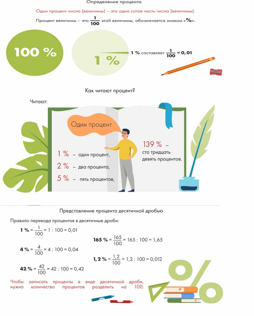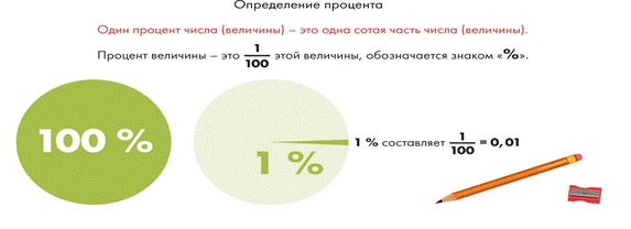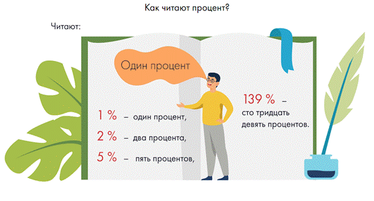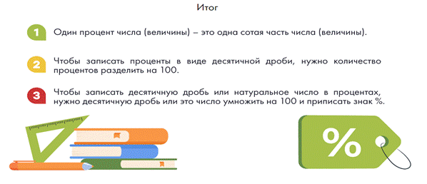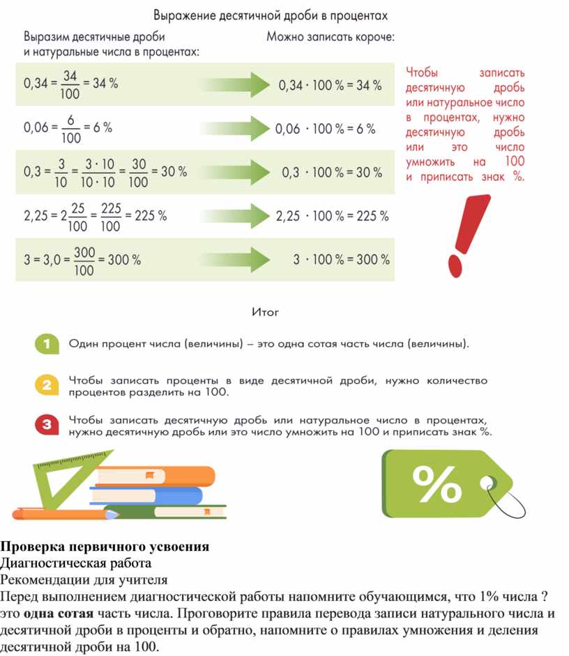Дайте определение процента как одной сотой части числа (величины). Расскажите обучающимся, как читают записи, содержащие проценты. Обсудите примеры записи процентов в виде десятичной дроби, выделите общее, сформулируйте правило. Предложите обучающимся самостоятельно вывести правило перевода натурального числа и десятичной дроби в проценты.