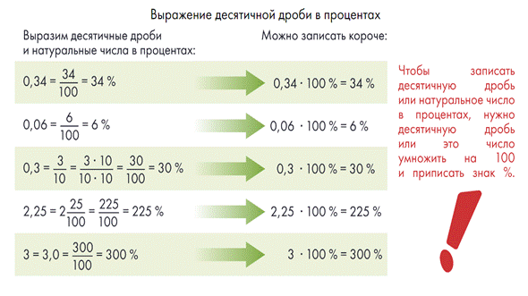 Чтобы выразить натуральное число или десятичную дробь в процентах, нужно это число или дробь на 100 и приписать знак %.