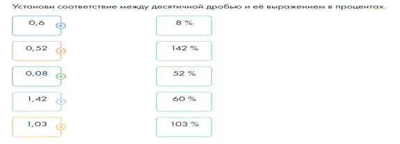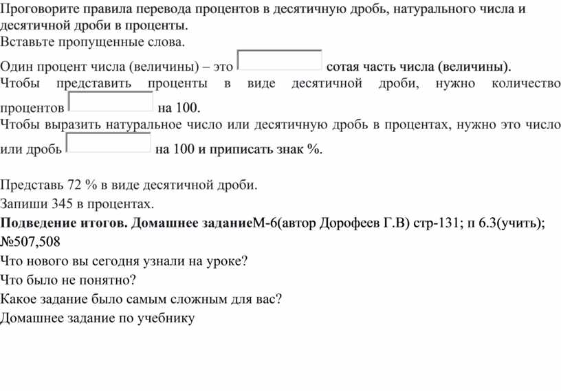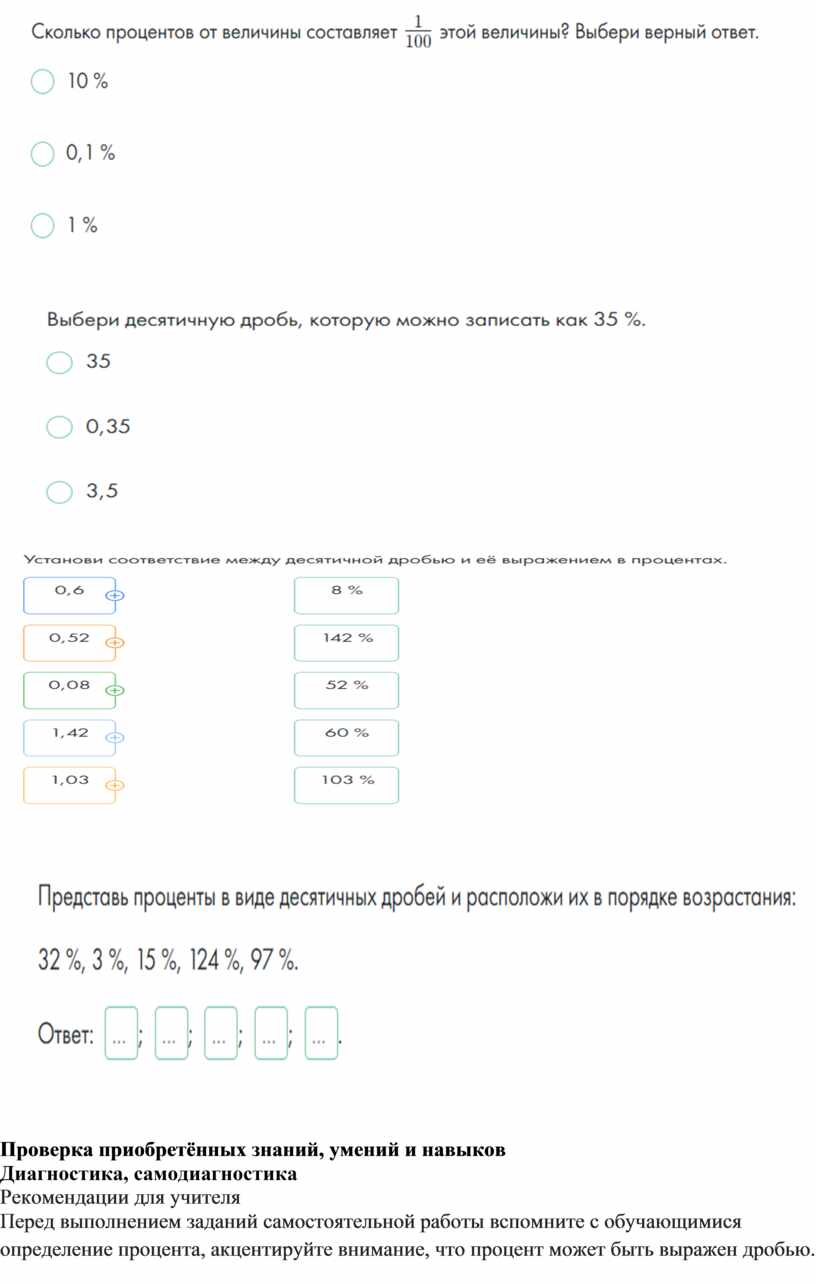 Перед выполнением заданий самостоятельной работы вспомните с обучающимися определение процента, акцентируйте внимание, что процент может быть выражен дробью. Проговорите правила перевода процентов в десятичную дробь, натурального числа и десятичной дроби в проценты.