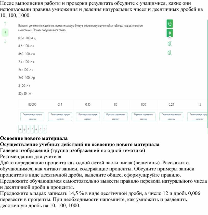 Предложите в парах записать 14,5 % в виде десятичной дроби, а число 12 и дробь 0,006 перевести в проценты. При необходимости напомните, как умножить и разделить десятичную дробь на 10, 100, 1000.