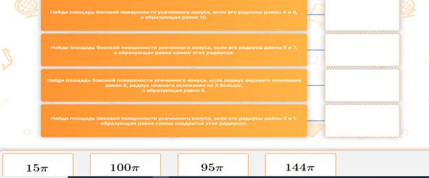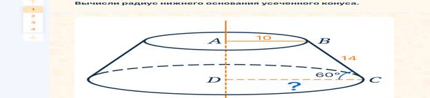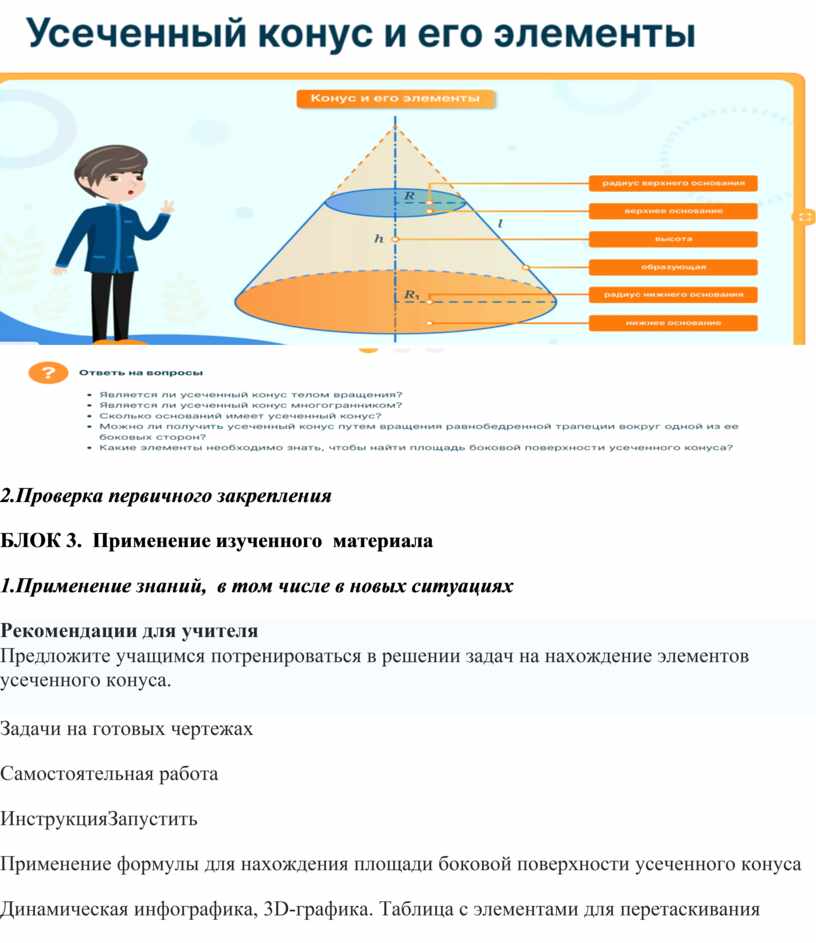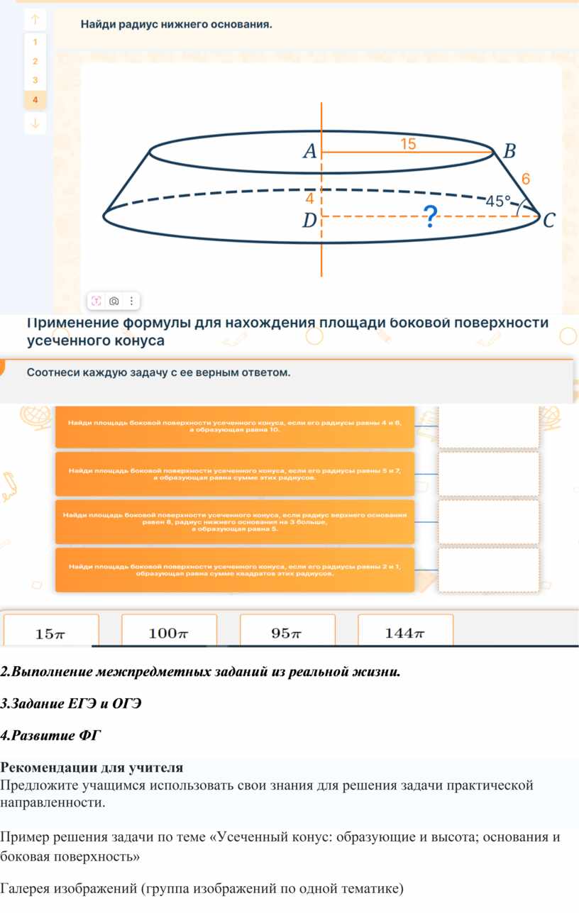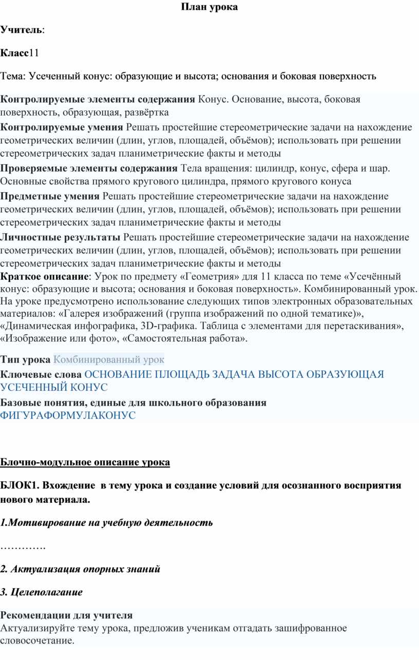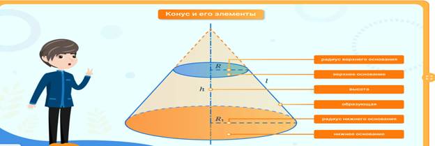 Краткое описание: Урок по предмету «Геометрия» для 11 класса по теме «Усечённый конус: образующие и высота; основания и боковая поверхность». Комбинированный урок. На уроке предусмотрено использование следующих типов электронных образовательных материалов: «Галерея изображений (группа изображений по одной тематике)», «Динамическая инфографика, 3D-графика. Таблица с элементами для перетаскивания», «Изображение или фото», «Самостоятельная работа».