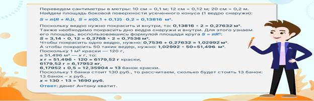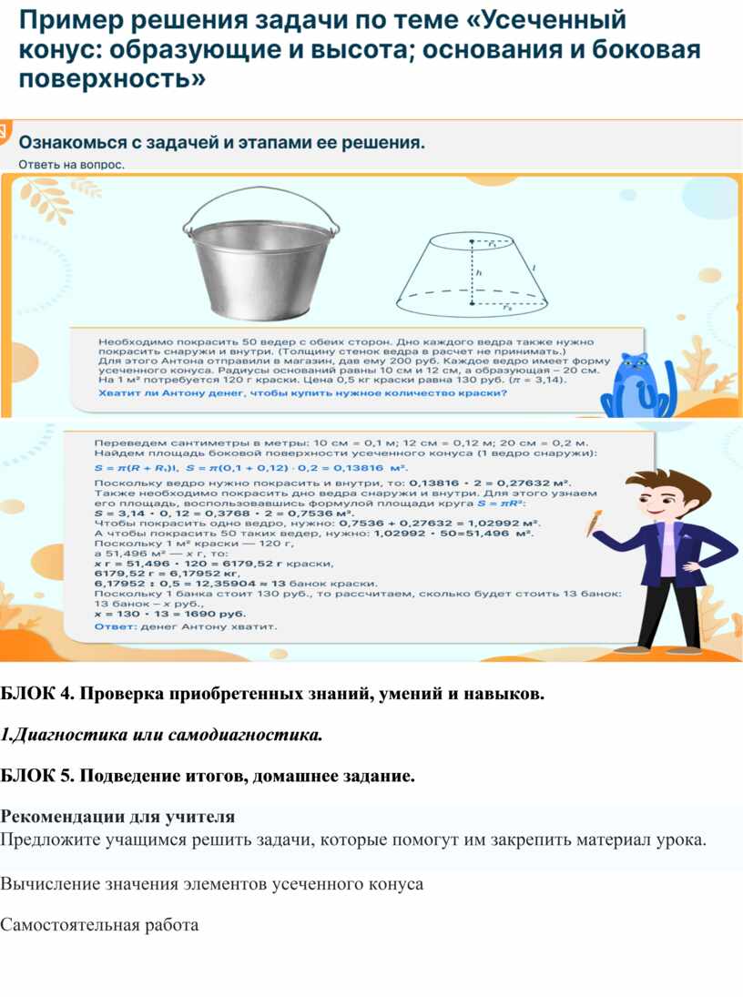 Пример решения задачи по теме «Усеченный конус: образующие и высота; основания и боковая поверхность»