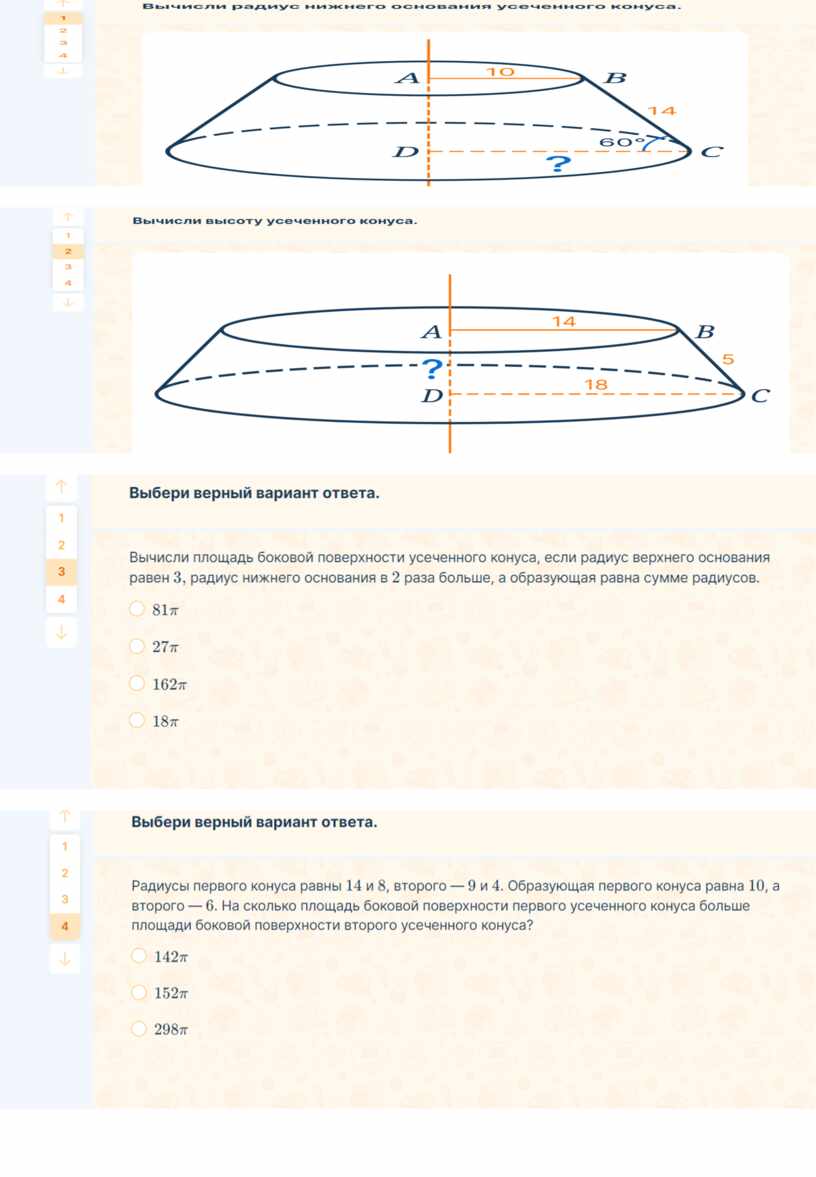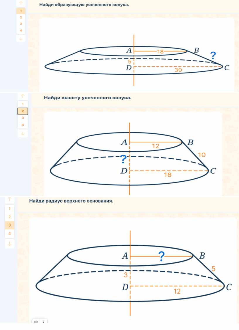 Предложите учащимся потренироваться в решении задач на нахождение элементов усеченного конуса.
