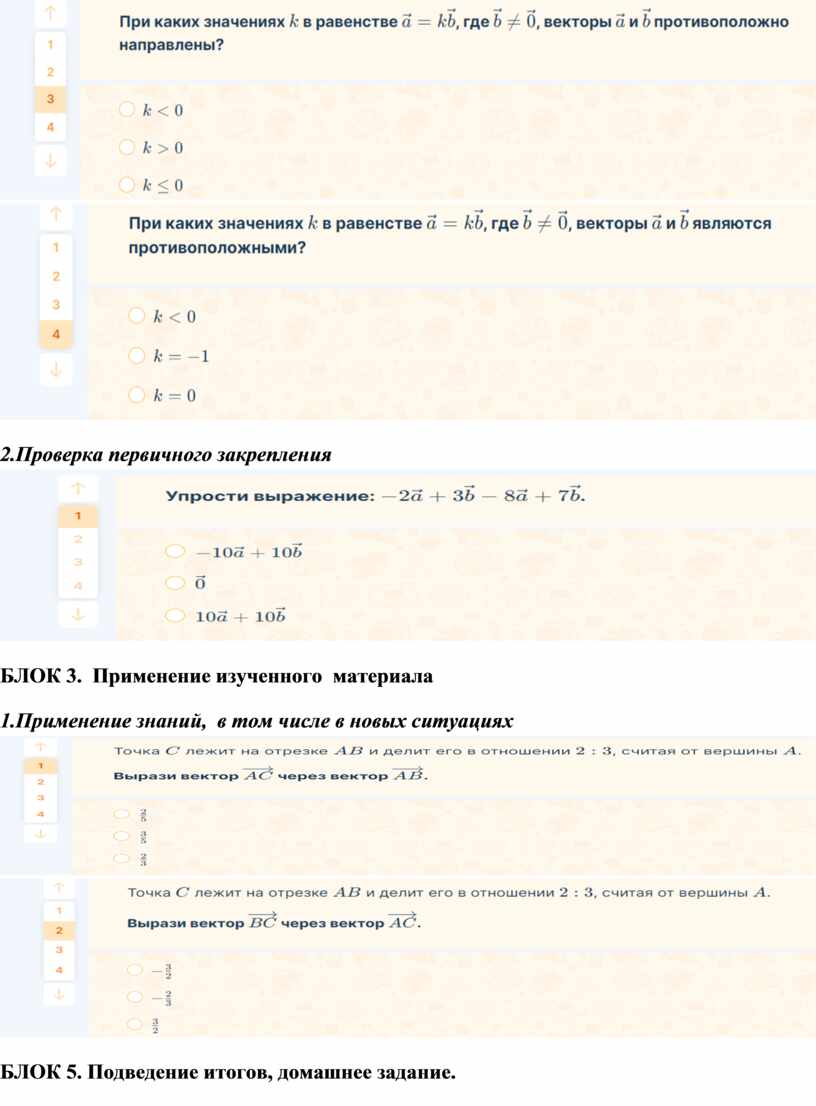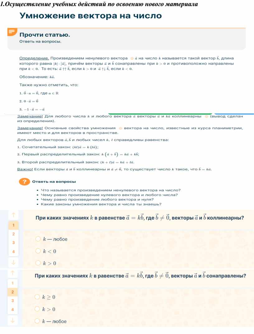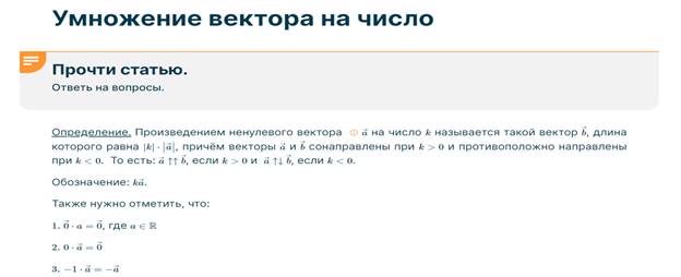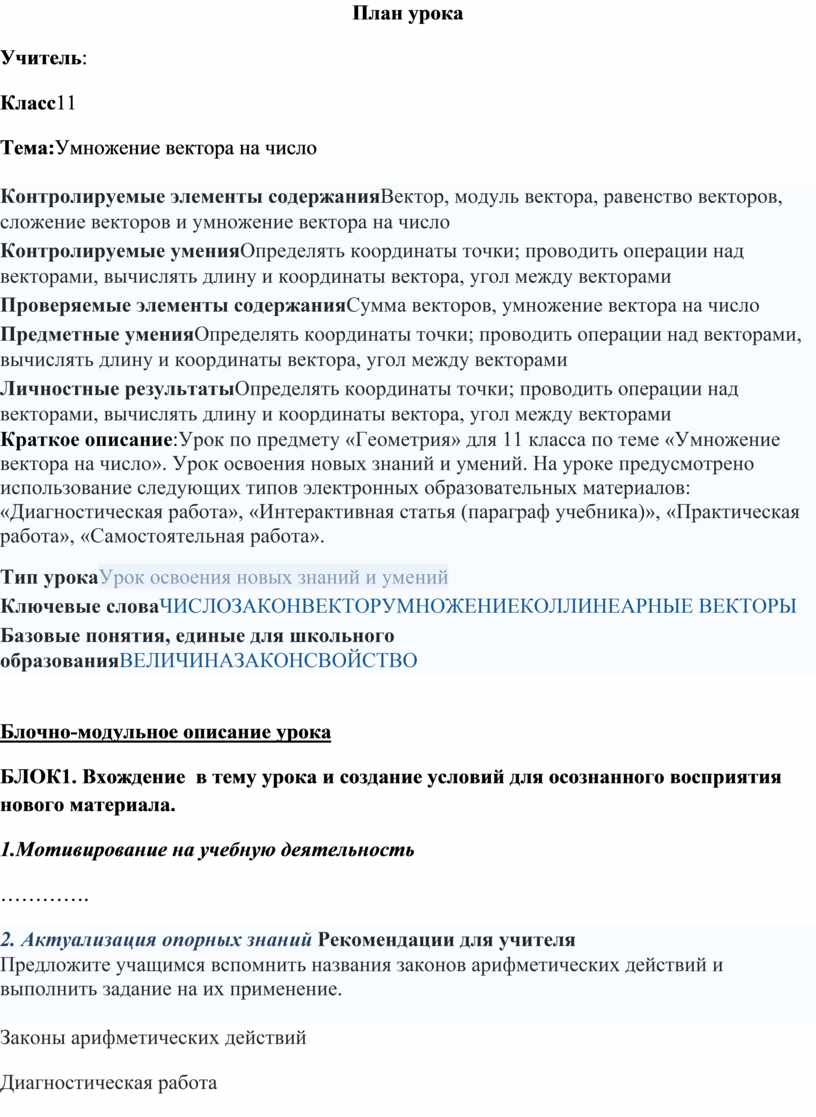 Краткое описание:Урок по предмету «Геометрия» для 11 класса по теме «Умножение вектора на число». Урок освоения новых знаний и умений. На уроке предусмотрено использование следующих типов электронных образовательных материалов: «Диагностическая работа», «Интерактивная статья (параграф учебника)», «Практическая работа», «Самостоятельная работа».
