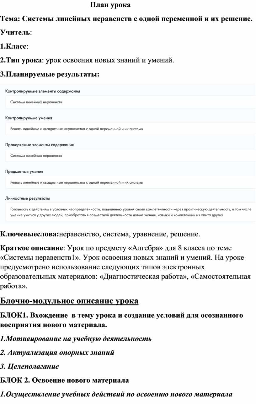 Краткое описание: Урок по предмету «Алгебра» для 8 класса по теме «Системы неравенств1». Урок освоения новых знаний и умений. На уроке предусмотрено использование следующих типов электронных образовательных материалов: «Диагностическая работа», «Самостоятельная работа».