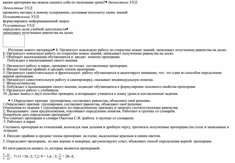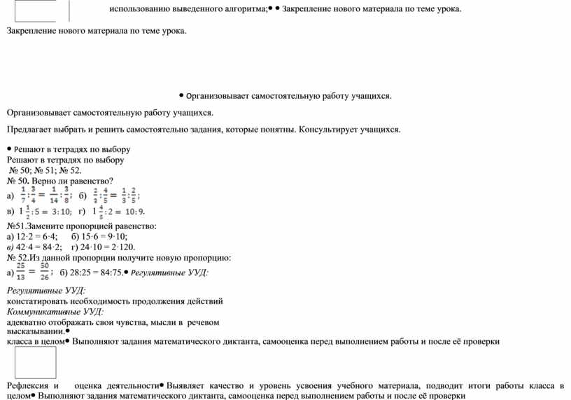 1. Организует поисковую работу по открытию новых знаний, записывает полученные равенства на доске. 2. Обобщает высказывания обучающихся и вводит понятие пропорции. Побуждает к высказыванию своего мнения. 3. Организует работу в парах, проверяет на столах составленные пропорции. 4. Вводит понятие крайних и средних членов пропорции. 5. Организует самостоятельную и фронтальную работу обучающихся и акцентирует внимание, что это один из способов определения верной пропорции. 6. Организует самостоятельную работу и самопроверку, оказывает индивидуальную помощь 7. Физкультминутка 8. Побуждает к высказыванию своего мнения, подводит обучающихся к формулировке основного свойства пропорции 9. Организует работу с учебником. 10. Делает вывод о двух способах проверки, и возвращает учащихся к плану урока и поставленным задачам.