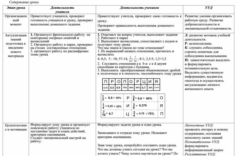 0,5; 5 : 10; 57-14; 2. Составить отношения a к b и c к d двумя способами из карточек с буквами. 3. Выполнить преобразования обыкновенных дробей в десятичные и в проценты, расшифровать тему урока