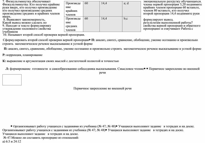 7. Физкультминутка обеспечивает эмоциональную разгрузку обучающихся. Физкультминутка: Кто получил крайние члены первой пропорции 3,20 поднимите руки вверх, кто получил произведение крайних членов пропорции 60 встаньте, кто получил произведение средних членов 80 встаньте, кто получил произведение средних и крайних членов второй пропорции 14,4 поднимите руки вверх. 8. Выявляют закономерность, формулируют вывод. Какой вывод можно сделать по результатам выполненной работы? 9. Находят в тексте формулировку свойства верной пропорции и обратного утверждения «основного свойства пропорции» и озвучивают Работа с учебником 10. Называют второй способ проверки верной пропорции. Сформулировать второй способ проверки верной пропорции |